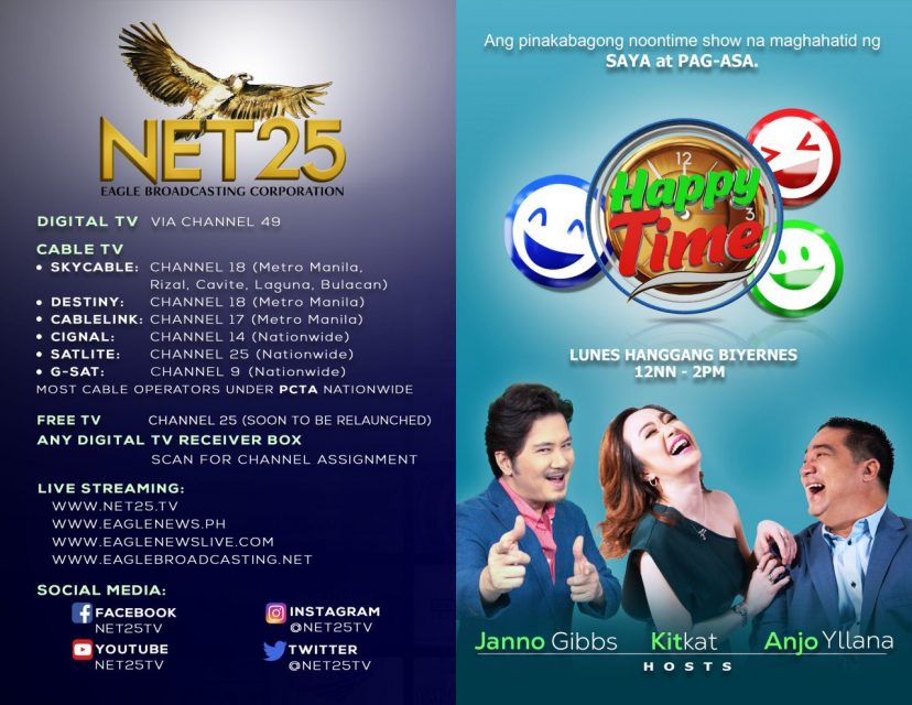 Happy Time is aired Monday to Friday, 12NN – 2 PM. With hosts, Anjo Yllana, Kitkat, and Janno Gibbs, the newest noontime show in the country and NET25’s first, brings fun and surprises to audiences worldwide.