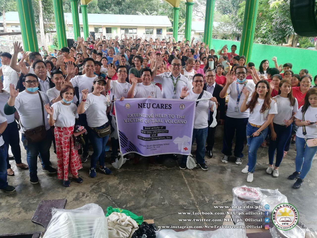 “The New Era University is one with the Filipino nation in helping out our fellow men affected by the volcanic eruption,” NEU said in a release after its alumni association made the trek to Batangas to hand out relief goods to the victims of Taal Volcano