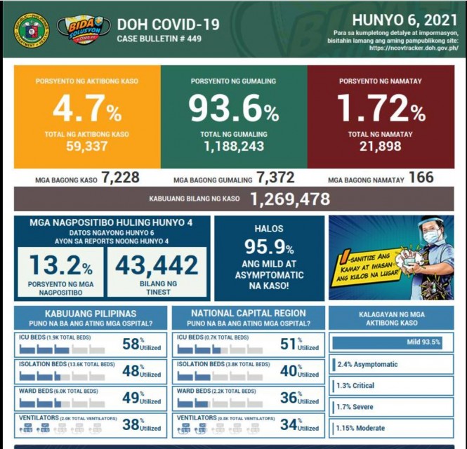(Eagle News) – New COVID-19 cases continued to rise as 7,228 new infections were reported on Sunday, June 6. This brought the number of total active cases to 59,997, or 4.7 percent of the total number of confirmed cases (1,269,478).