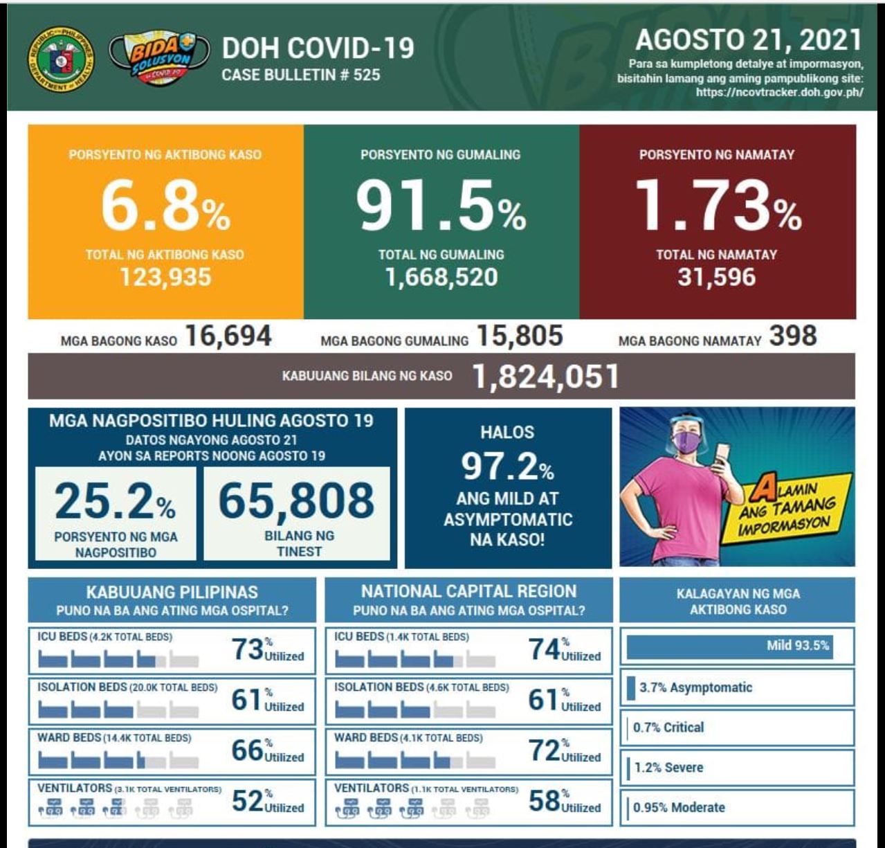 (Eagle News) – COVID-19 deaths recorded on Saturday, Aug. 21, rose to 398 from Friday’s record of 317 as the Philippines reported 16,694 new COVID cases.