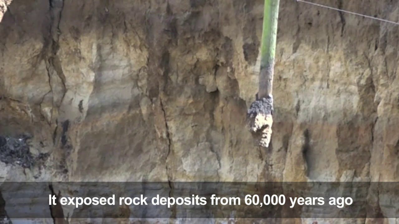 The chasm appeared after heavy rainfall near the town of Rotorua and left a jagged scar on the landscape, exposing rock deposits from 60,000 years ago.