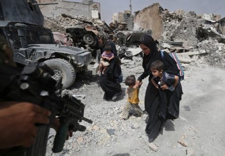 Iraqis flee the Old City of Mosul on July 3, 2017, during the Iraqi government forces’ ongoing offensive to retake the city from Islamic State (IS) group fighters. Iraqi forces have been closing in on the Old City in west Mosul for months, but the terrain combined with a large civilian population has made for an extremely difficult fight. / AFP / Ahmad Al-Rubaye