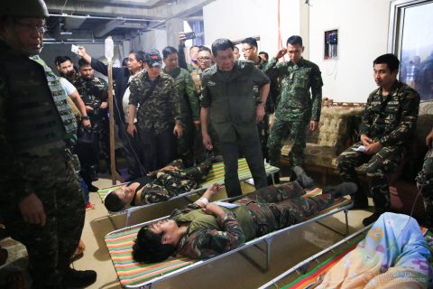 President Rodrigo Duterte checks on the condition of wounded soldiers during his visit to the troops of the Tactical Command Post (TCP) Joint Special Operations Task Force (JSOTF) at Barangay Kilala in Marawi City on August 4, 2017. (Presidential Communications photo)