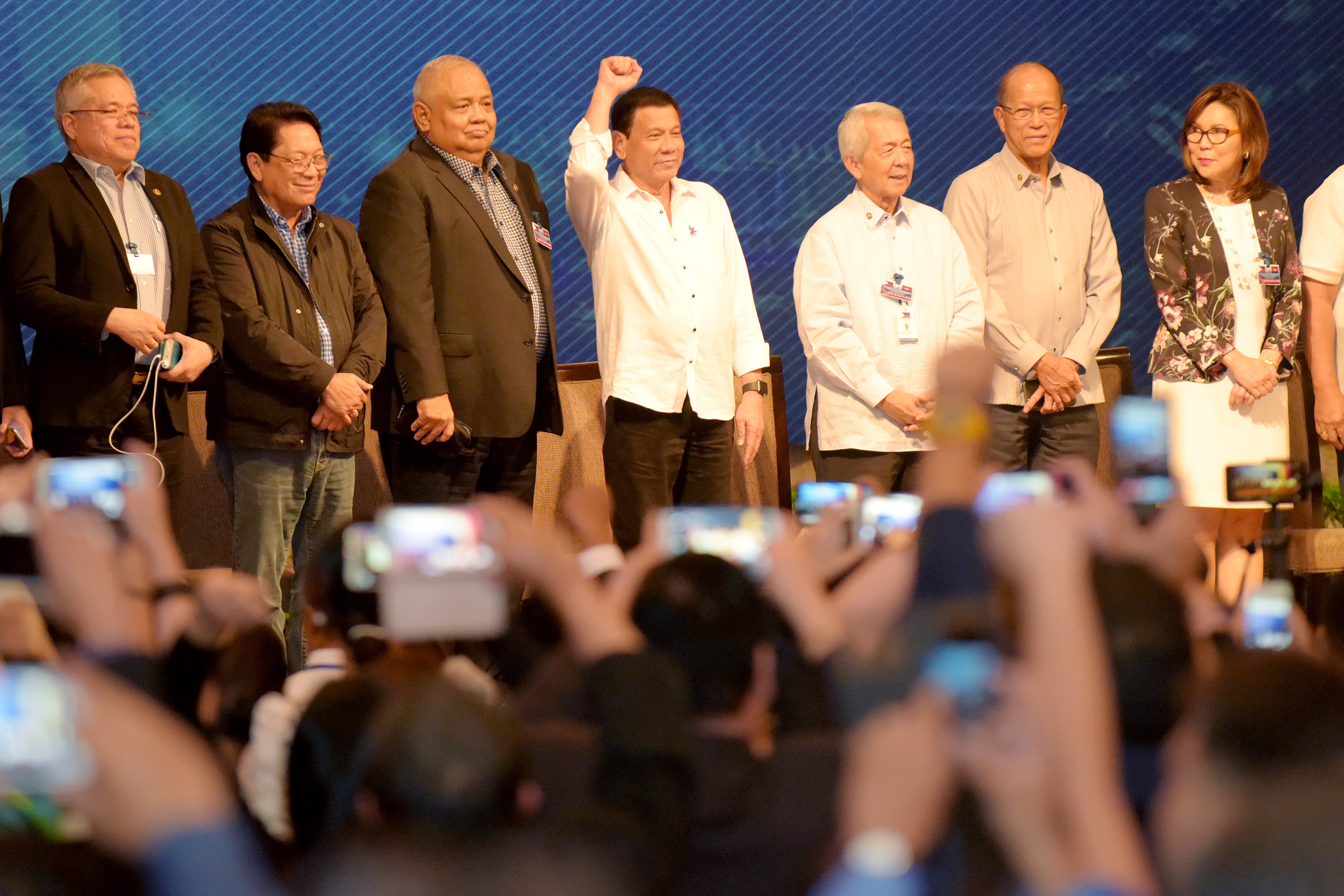 Philippine President Rodrigo Duterte greets members of the Filipino community as he arrives in the Cambodian capital Phnom Penh on December 13, 2016.