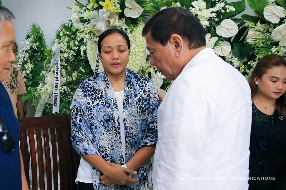President Rodrigo Roa Duterte condoles with Sheila Gonzaga, wife of Major Harim Gonzaga who was found dead inside his quarters at the Presidential Security Group (PSG) Compound in Malacañang Park on September 26, 2017. The President visited the wake of the late PSG Operations Section member on September 27, 2017. ALBERT ALCAIN/PRESIDENTIAL PHOTO