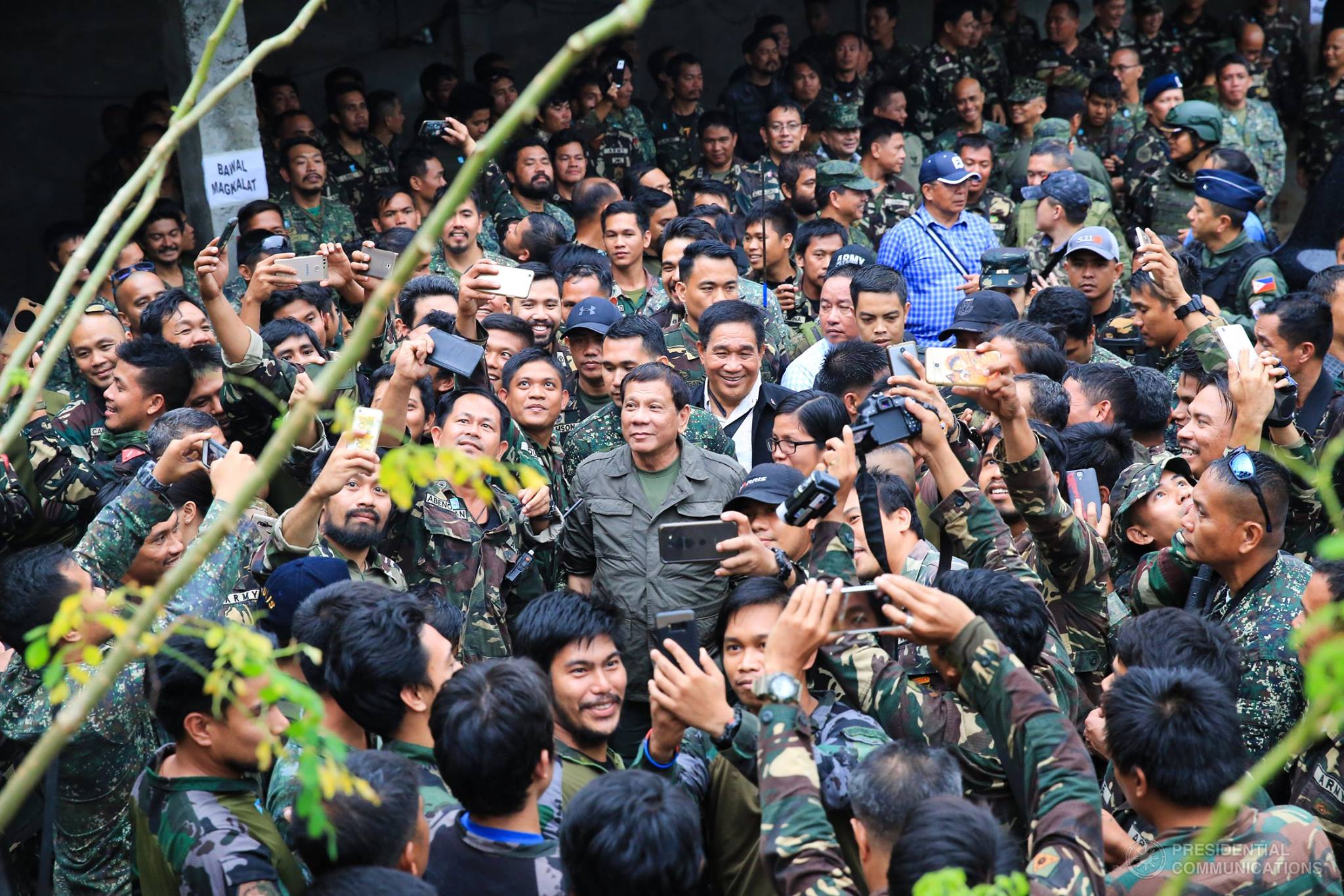 Duterte visited the government troops at the Tactical Command Post of the Joint Special Operations Task Force (JSOTF) at Barangay Kilala in Marawi City.