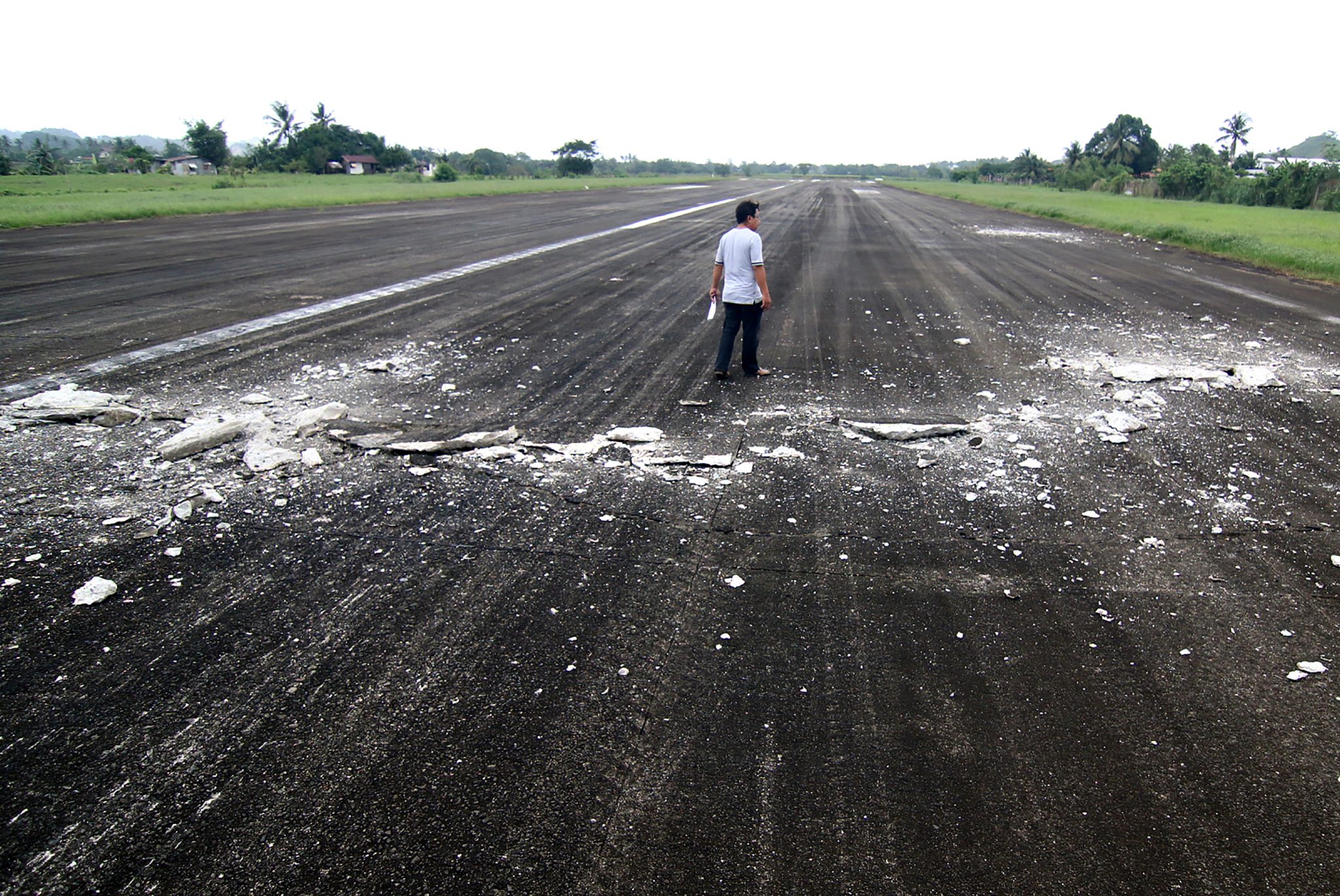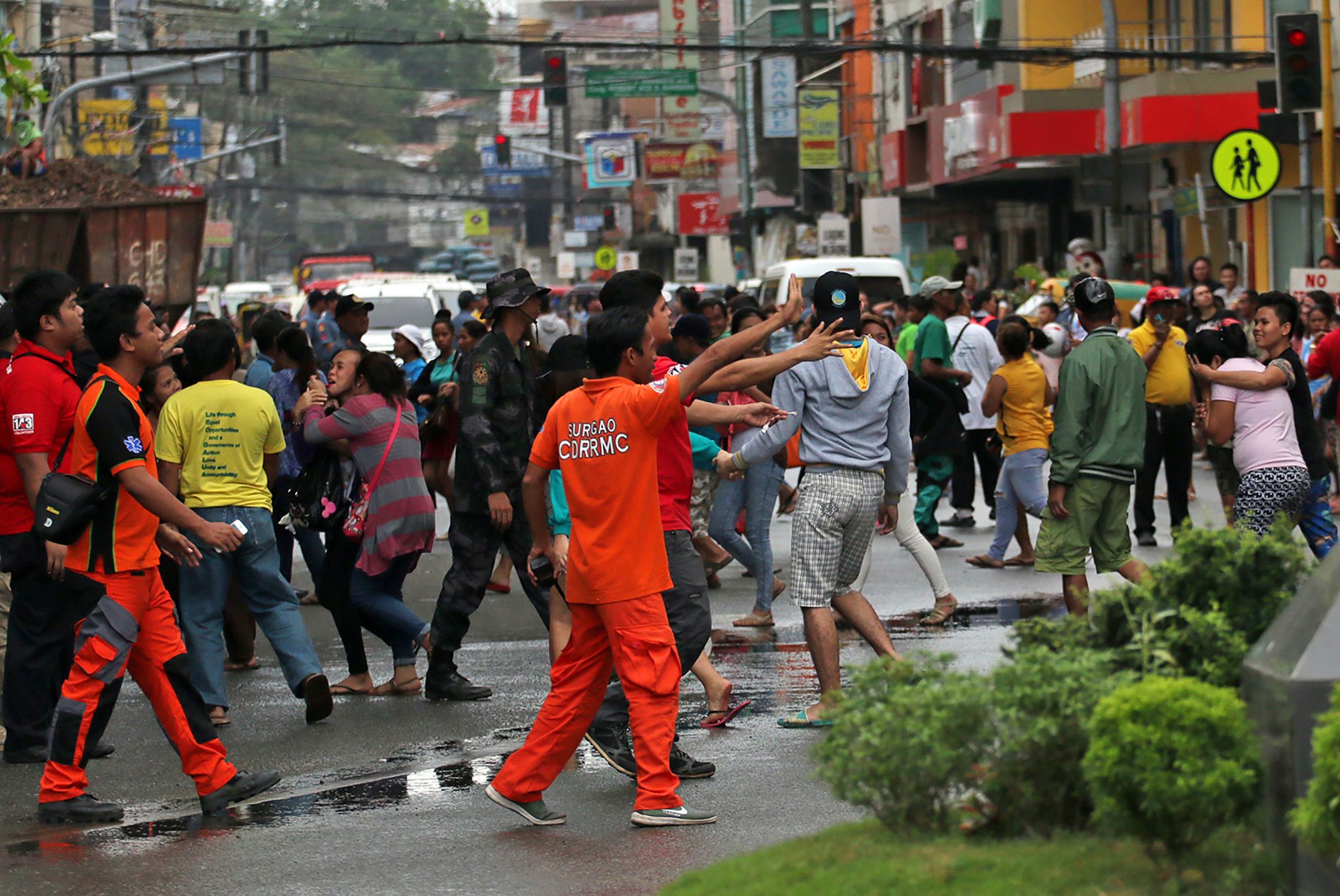 Residents cross a river after a bridge linking the city to nearby towns was destroyed, after a 6.7-magnitude earthquake struck overnight, in Surigao City in the southern island of Mindanao on February 11, 2017. Rescuers dug through rubble on February 11 to find survivors after a powerful earthquake struck the southern Philippines, killing at least four people and sending thousands fleeing for safety. / AFP PHOTO / ERWIN MASCARINASResidents stand on one end of a bridge, linking the city of Surigao to nearby towns, which was damaged after a 6.7-magnitude earthquake struck overnight, in Surigao City in southern island of Mindanao on February 11, 2017. Rescuers dug through rubble on February 11 to find survivors after a powerful earthquake struck the southern Philippines, killing at least four people and sending thousands fleeing for safety. ERWIN MASCARINAS / AFP PHOTOHospital patients take shelter in a pedestrian-waiting shed for safety after a 6 .7-magnitude earthquake struck overnight in Surigao City, in southern island of Mindanao, February 11, 2017. A strong quake shook the southern Philippines on February 10, killing at least three people, toppling buildings and sending panicked residents fleeing their homes, media reports and authorities said. / AFP PHOTO / ERWIN MASCARINASA man walks past the damaged runway of the dometic airport after a 6.7-magnitude earthquake struck overnight in Surigao City in southern island of Mindanao on February 11, 2017. A strong quake shook the southern Philippines on February 10, killing at least three people, toppling buildings and sending panicked residents fleeing their homes, media reports and authorities said. / AFP PHOTO / ERWIN MASCARINASA vehicle is struck by debris from a damaged school building after a 6.7-magnitude earthquake struck overnight in Surigao City, in the southern island of Mindanao, on February 11, 2017.A strong quake shook the southern Philippines on February 10, killing at least three people, toppling buildings and sending panicked residents fleeing their homes, media reports and authorities said. / AFP PHOTO / ERWIN MASCARINASResidents run to a main road as rescuers (in orange) give instructions as strong after-shocks struck, prior to the arrival of Philippine President Rodrigo Duterte in Surigao City, in southern island of Mindanao on February 12, 2017, days after a 6.7-magnitude earthquake hit the city. Duterte flew to the region on February 12, to inspect the response effort, which officials said has shifted to relief and rehabilitation after the last of the dead and injured were pulled from the rubble. / AFP PHOTO / ERWIN MASCARINAS