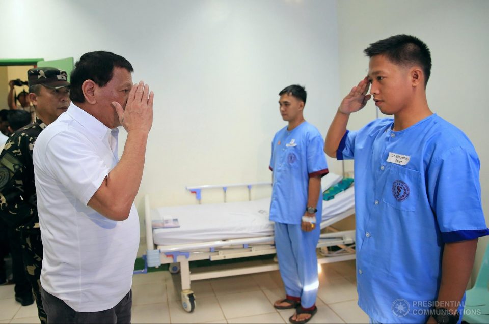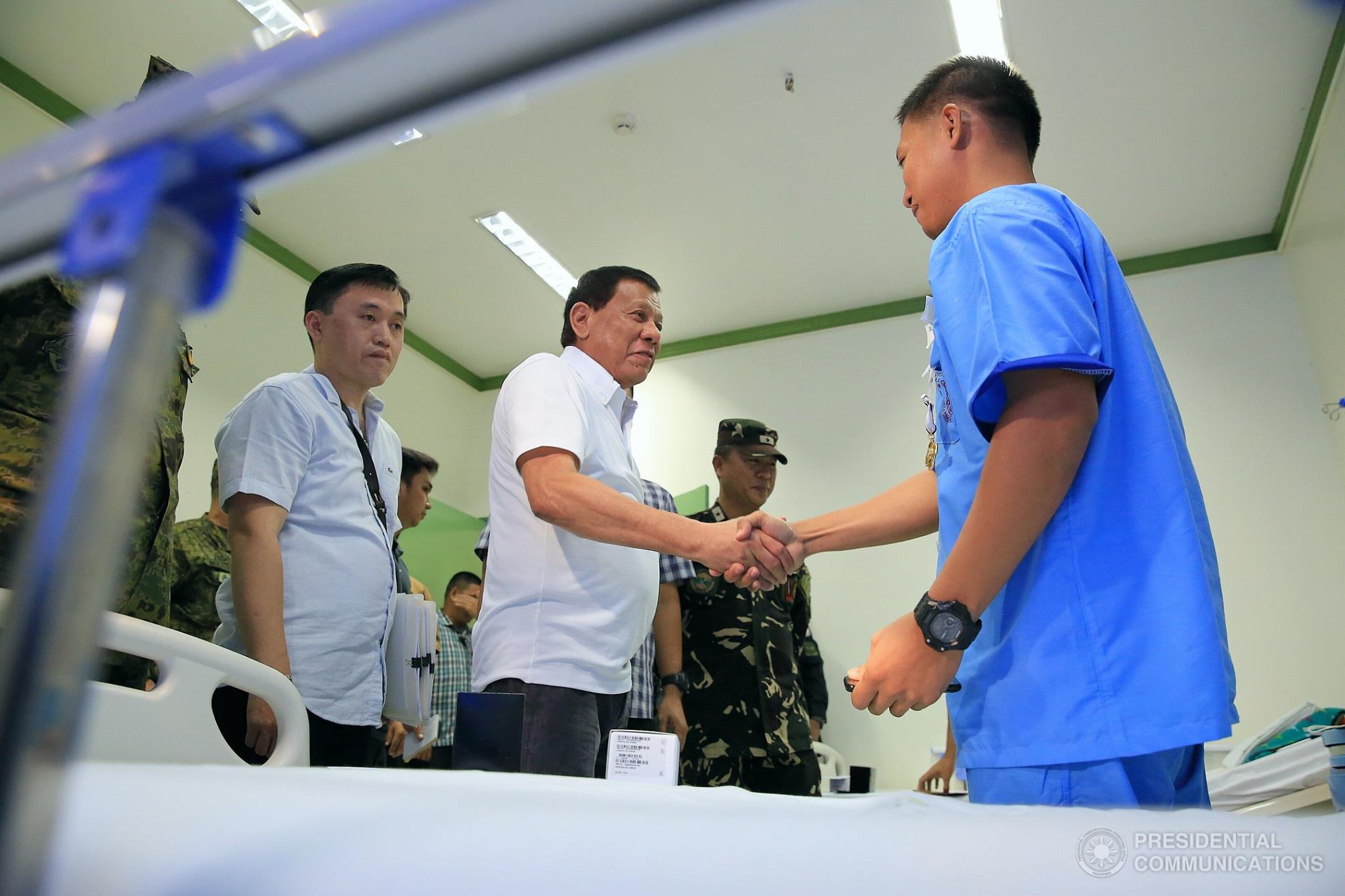President Rodrigo Duterte on Saturday, July 15 visited wounded troops at the Camp Teodulfo Bautista Station Hospital in Jolo, Sulu.