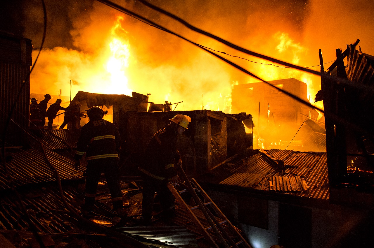 Firefighters try to extinguish a fire that destroyed hundreds of houses at an informal settlers community in Delpan, Tondo, Manila on February 7, 2017. / AFP PHOTO / NOEL CELIS /