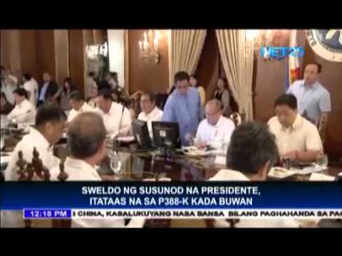 If the Salary Standardization Law endorsed by President Aquino is approved by the Senate, the salary of the next president will also increase from Php 120, 000 to Php 388, 000. Also to be increased is the salary of the Vice-President from Php 107, 099 to Php 330, 418.