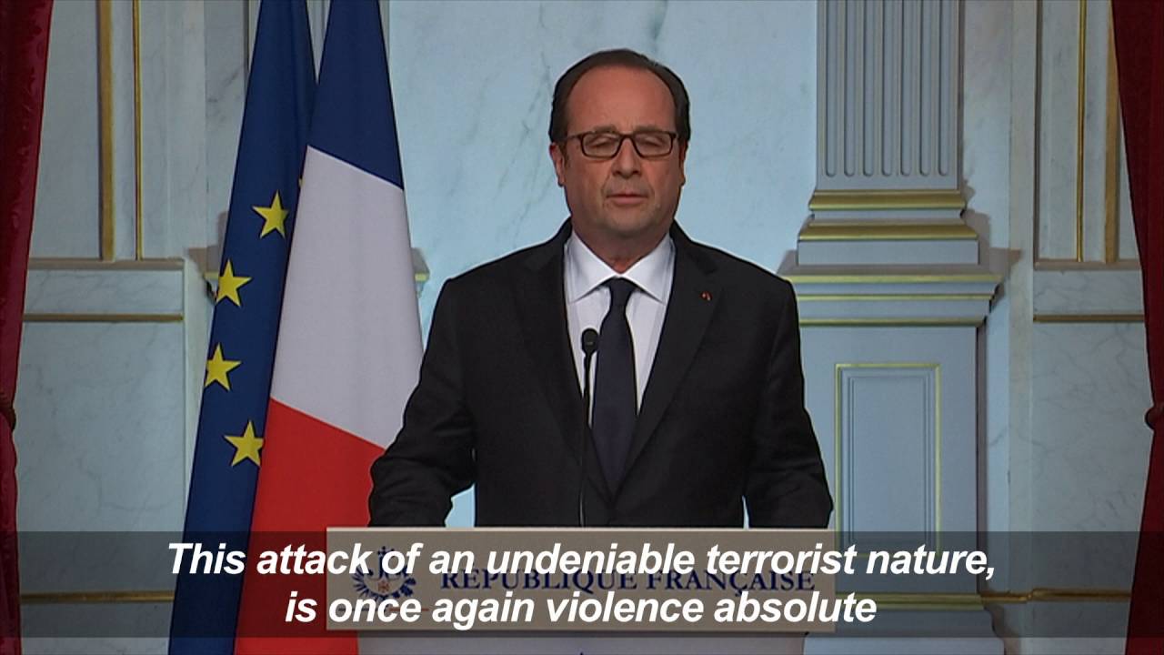 President Francois Hollande says the truck which ploughed into a crowd in the French Riviera resort of Nice, killing more than 80 people, was a “terrorist” attack on revellers watching a Bastille Day fireworks display. (Courtesy AFP TV)