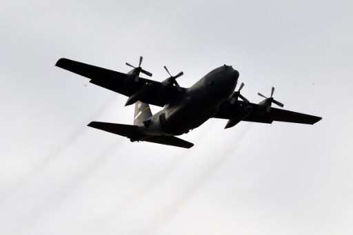 A French Air Force Lockheed C-130 Hercules military transport aircraft is pictured during the “Colibri” interallied exercise, reuniting thousands of French, German, American, Spanish and British parachutists on September 25, 2016, at the Caylus military installation, in the Tarn-et-Garonne region. / AFP PHOTO