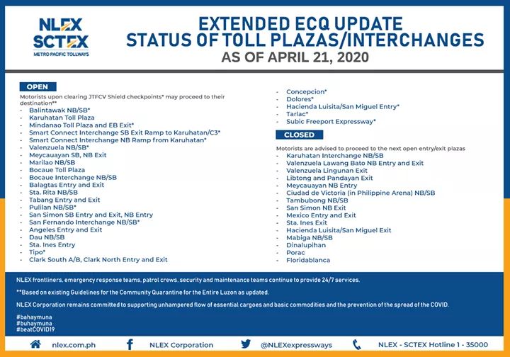 NLEx Corp. made the announcement as it released its updated list of toll plazas on NLEx and the Subic-Clark-Tarlac Expressway amid the enhanced community quarantine.
