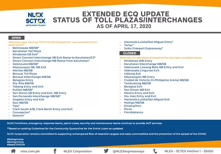 (Eagle News)–The Northern Luzon Expressway Corporation has released its list of toll plazas on NLEx and the Subic-Clark-Tarlac Expressway amid the enhanced community quarantine.