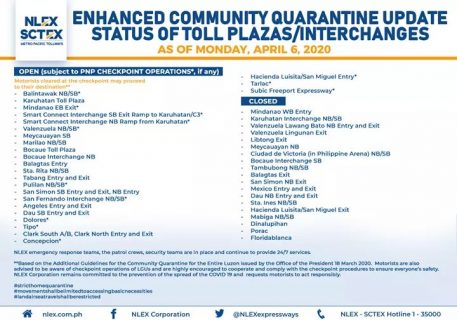 (Eagle News)–The Northern Luzon Expressway Corp. has released its list of toll plazas on NLEx and the Subic-Clark-Tarlac Expressway amid the enhanced community quarantine.