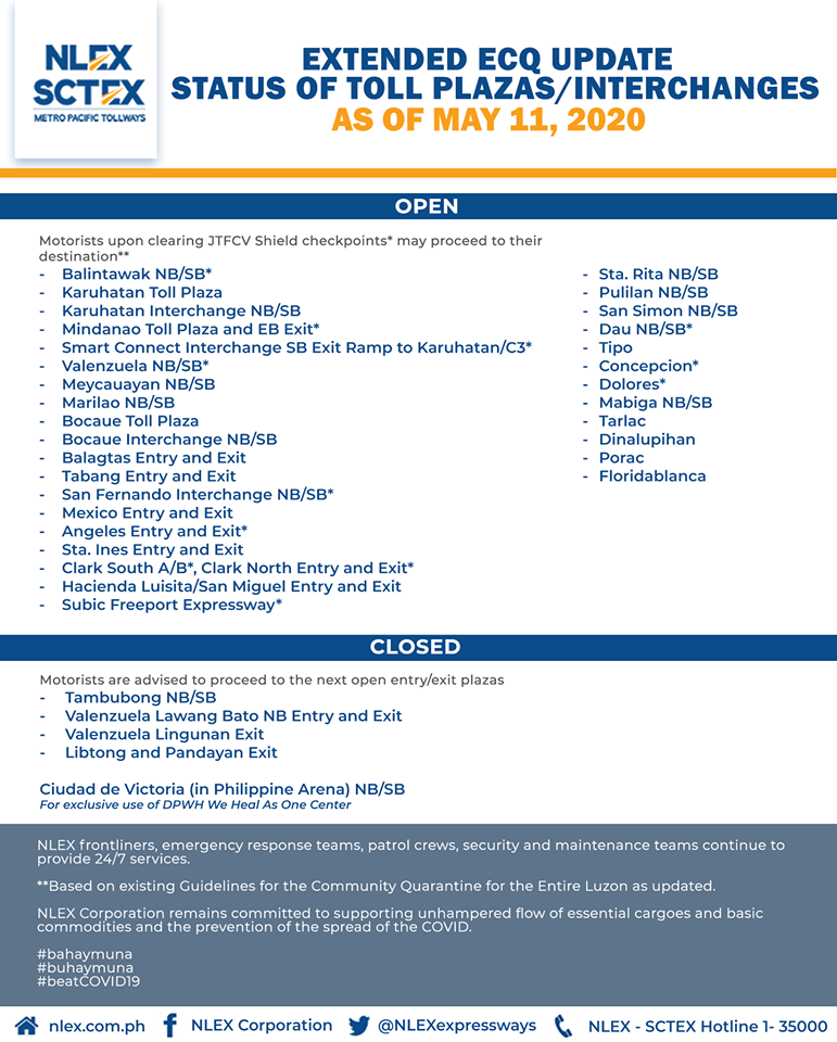 (Eagle News) — The North Luzon Expressway Corp. has released its list of toll plazas on NLEx and the Subic-Clark-Tarlac Expressway amid the extended enhanced community quarantine in selected areas.
