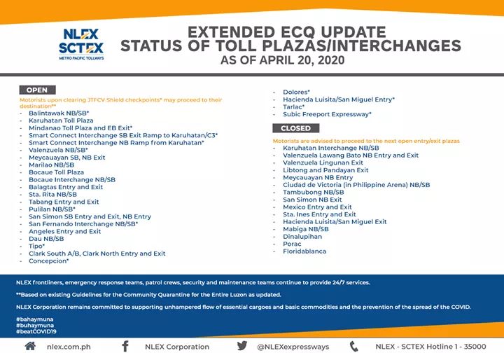 NLEx Corp. said the toll plazas were as of Monday, April 20: