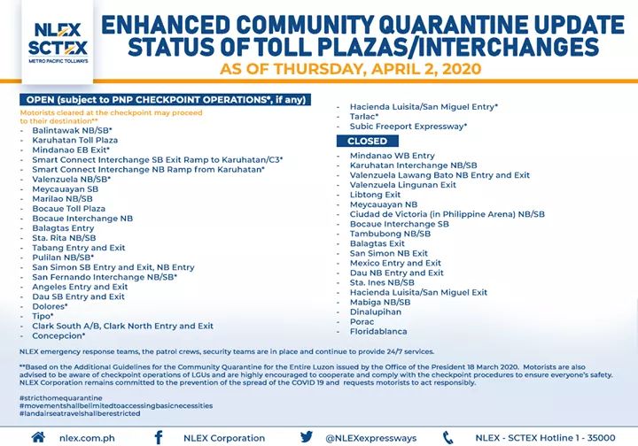 (Eagle News)–The Northern Luzon Expressway Corp. has released its list of updated toll plazas on NLEx and the Subic-Clark-Tarlac Expressway amid the enhanced community quarantine in Luzon.
