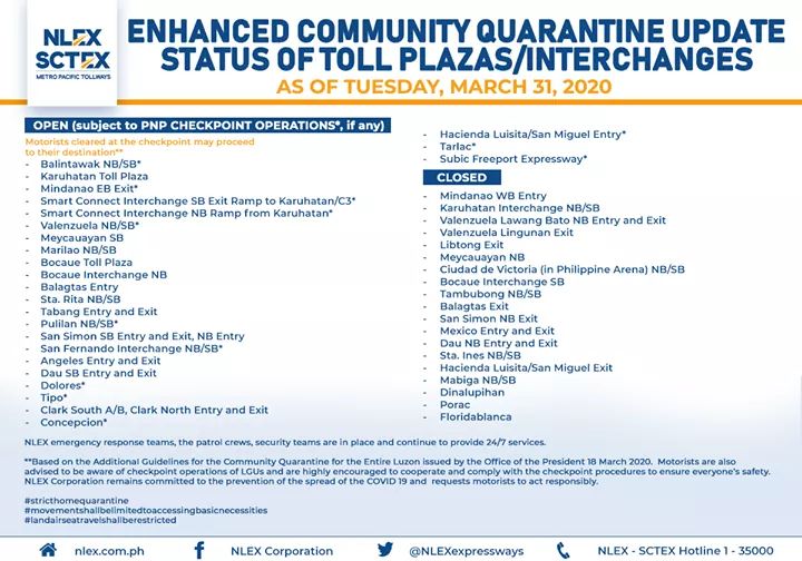 (Eagle News)–The Northern Luzon Expressway Corp. has released its list of updated toll plazas on NLEx and the Subic-Clark-Tarlac Expressway amid the enhanced community quarantine.