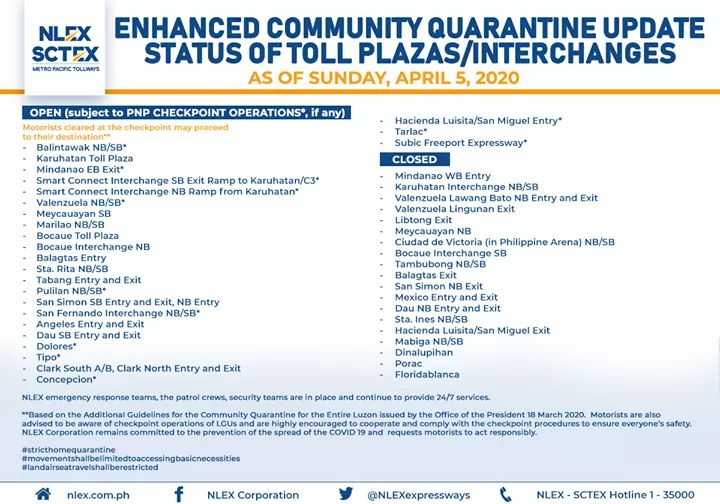 (Eagle News)–The Northern Luzon Expressway Corp. has released its list of toll plazas on NLEx and the Subic-Clark-Tarlac Expressway amid the enhanced community quarantine.