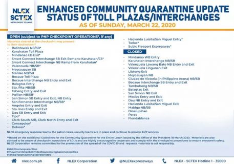 (Eagle News)–The Northern Luzon Expressway Corporation has released its updated list of open and closed toll plazas.