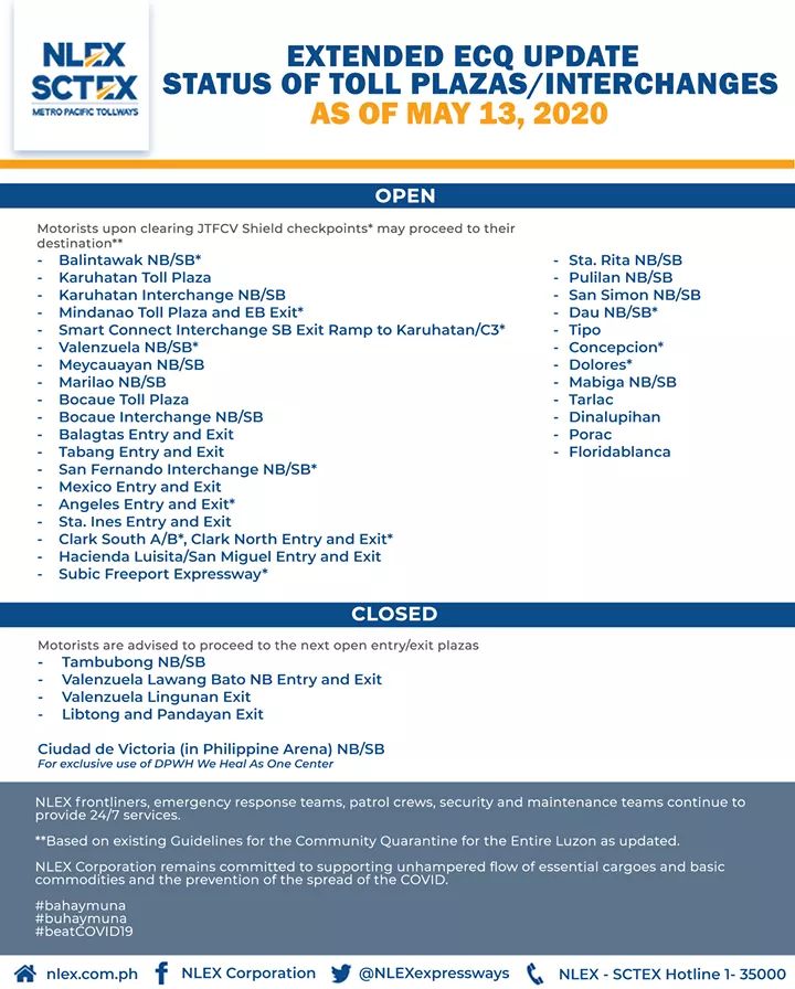 (Eagle News)–The Northern Luzon Expressway Corporation has released its list of toll plazas on NLEx and the Subic-Clark-Tarlac Expressway amid the extended enhanced community quarantine in some areas.