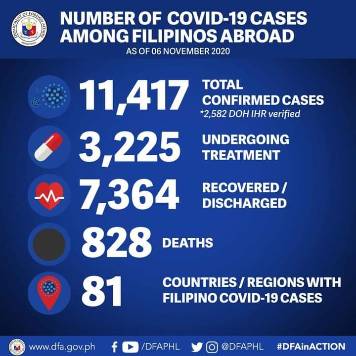 The Department of Foreign Affairs said the COVID-19 death toll among Filipinos abroad therefore remains at 828.