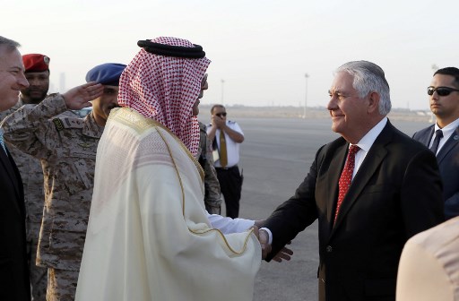 US Secretary of State Rex Tillerson arrived in Saudi Arabia Saturday, his second visit to the region in recent months as he seeks a breakthrough in a diplomatic crisis gripping the Gulf. / AFP PHOTO