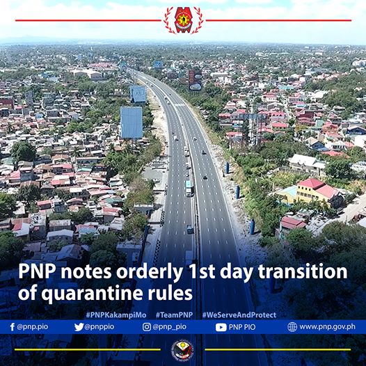 “The first day of transition to Modified Enhanced Community Quarantine and General Community Quarantine went ahead smoothly and orderly”, the PNP said in a statement.