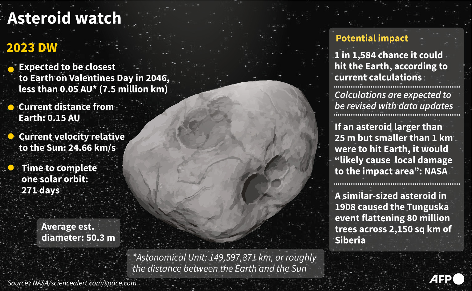 The asteroid, which is named 2023 DW and is estimated to be around the size of a 50-metre Olympic swimming pool, was first spotted by a small Chilean observatory on February 26.