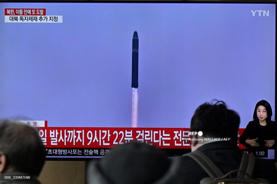 (FILE) People sit near a television showing a news broadcast with file footage of a North Korean missile test, at a railway station in Seoul on February 20, 2023. (Photo by Anthony WALLACE / AFP)