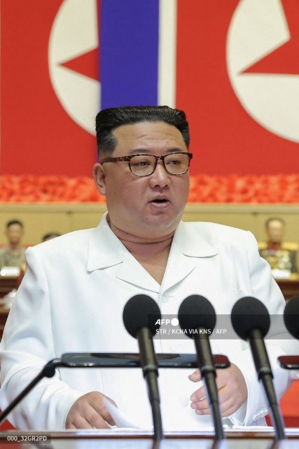 This picture taken on August 18, 2022 and released from North Korea’s official Korean Central News Agency (KCNA) on August 19, 2022 shows North Korea’s leader Kim Jong Un giving a speech to congratulate members of the military medical department of the Korean People’s Army for contributing to the prevention of the spread of Covid-19, in Pyongyang. (Photo by KCNA VIA KNS / AFP)