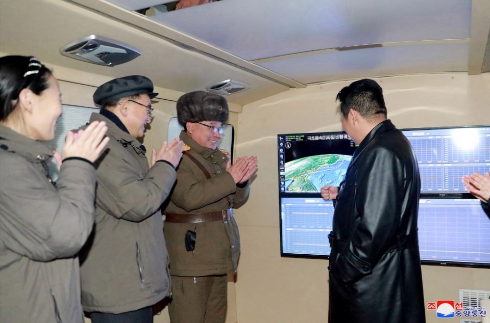 Photographs posted on the website of Rodong Sinmun, the official newspaper of the ruling Workers’ Party, showed Kim Jong Un wearing a long black leather coat and using binoculars to watch the missile blast off from his mobile viewing platform.