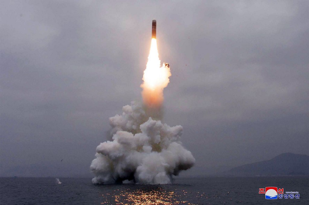 Photos carried by Pyongyang’s official Rodong Sinmun newspaper showed a black and white missile emerging from the water and appearing to shoot into the sky.