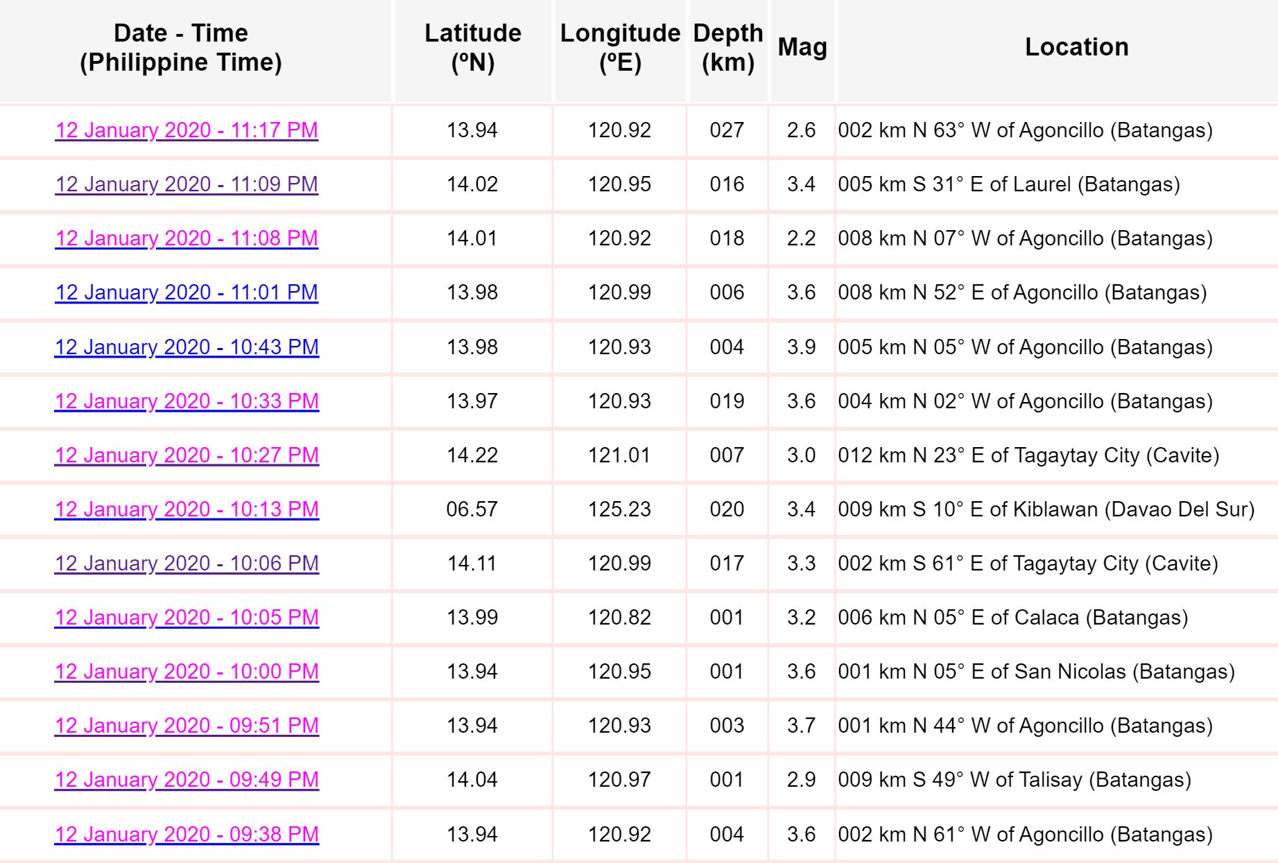 PHIVOLCS recorded a series of volcanic and tectonic quakes in Batangas, as well as in Tagaytay City in Cavite province starting Sunday afternoon, Jan. 12.
