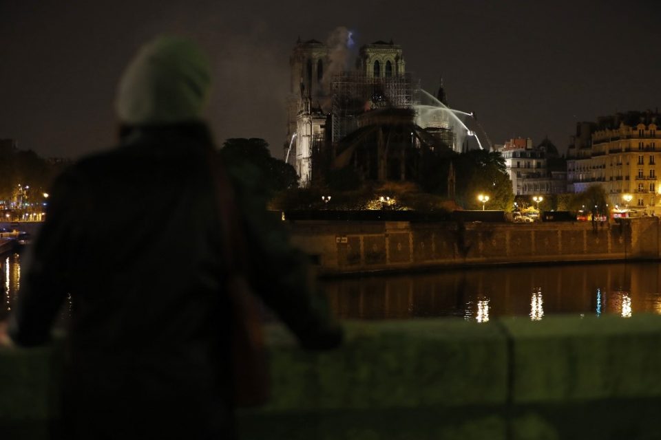 Bystanders look on as flames and smoke billow from the roof at Notre-Dame Cathedral in Paris early on April 16, 2019. – A major fire broke out at the landmark Notre-Dame Cathedral in central Paris sending flames and huge clouds of grey smoke billowing into the sky, the fire service said. The flames and smoke plumed from the spire and roof of the gothic cathedral, visited by millions of people a year, where renovations are currently underway. (Photo by Zakaria ABDELKAFI / AFP)