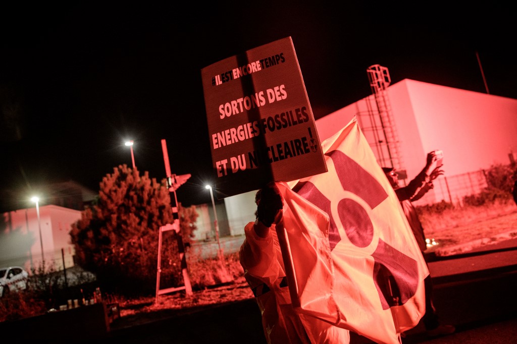 Let’s get out of fossil fuels and nuclear power” as he protests against a convoy transporting radioactive fuel with MOX (plutonium) at Cherbourg commercial harbour, where the plutonium is due to be shipped to Japan, in Cherbourg-Octeville, northwestern France, on September 8, 2021. (Photo by Sameer Al-DOUMY / AFP)