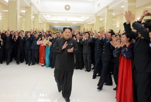 This photo taken on February 13, 2016 and released by North Korea’s official Korean Central News Agency (KCNA) on February 15, 2016 shows North Korean leader Kim Jong-Un (C) being welcomed by people during a party for scientists who contributed to the launch of the earth observation satellite Kwangmyong in Pyongyang. It was reported on February 15 that North Korean leader Kim Jong-Un has promised to put more satellites in space, even as the international community prepares to punish his regime over a long-range rocket launch just last week. REPUBLIC OF KOREA OUT —- AFP PHOTO / KCNA via KNS