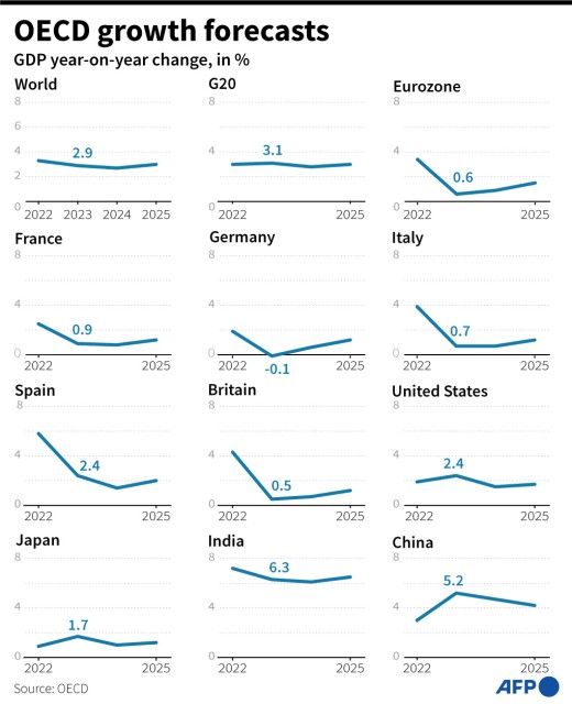 PARIS, Nov 29, 2023 (AFP) – The world economy is likely headed for a soft landing next year, the OECD said Wednesday as it pared back its growth forecast, but warned the Israel-Hamas conflict could throw a spanner in the works.