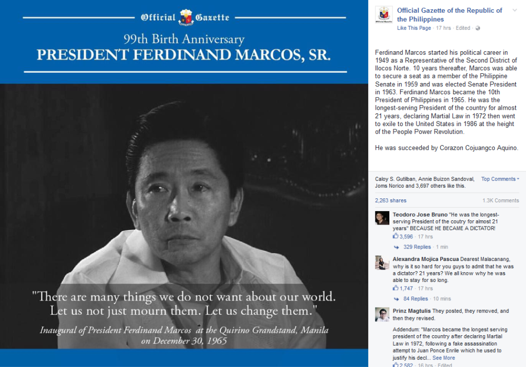 After numerous revisions, the post now reads: “He was the longest-serving President of the country for almost 21 years, declaring Martial Law in 1972 then went to exile to the United States in 1986 at the height of the People Power Revolution. He was succeeded by Corazon Cojuangco Aquino.”