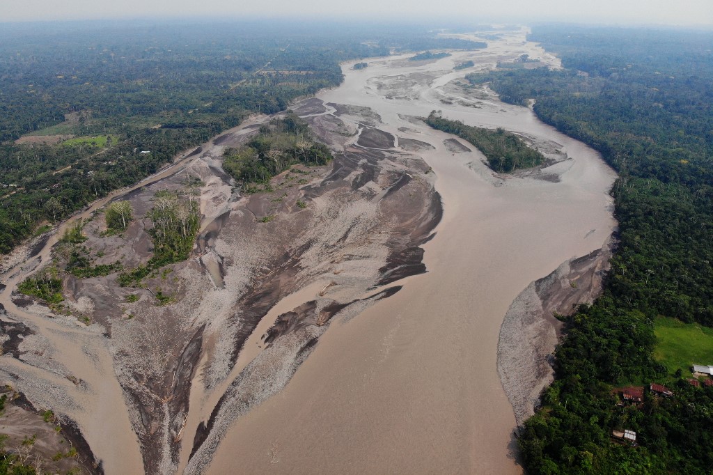 Aerial view showing the oil spill at the Coca river in Puerto Maderos village, Sucumbios province, Ecuador on February 1, 2022. – An oil spill in eastern Ecuador has reached a nature reserve and polluted a river that supplies water to indigenous communities, according to the country’s environmental ministry. (Photo by Cristina Vega RHOR / AFP)