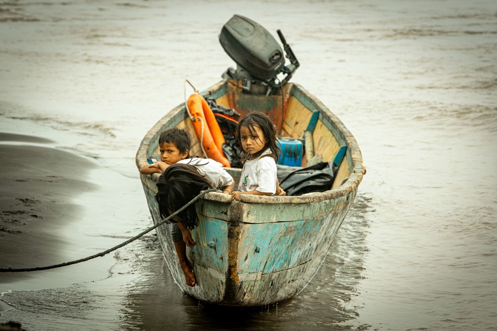 Children remain on a boat, after crude reached the Coca river due to an oil spill, in Puerto Maderos, Sucumbios province, Ecuador, on February 1, 2022. – An oil spill caused by a ruptured pipeline in Ecuador’s Amazon region leaked almost 6,300 barrels into an environmental reserve, according to information provided Wednesday by the company that owns the conduit. (Photo by Cristina Vega RHOR / AFP)