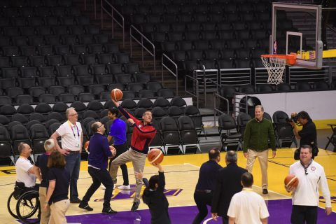 IOC delegates and LA 2024 bid officials shot hoops on the court famously graced by the likes of Kobe Bryant and Shaquille O’Neal during the Lakers’ most recent golden era.