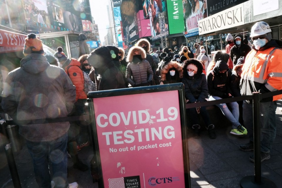 People wait in long lines in Times Square to get tested for Covid-19 on December 20, 2021 in New York City. New York City, which was initially overwhelmed by the Covid pandemic, has once again seen case numbers surge as the new omicron variant becomes dominant. Positivity rates in the city now stand at 8.41% with hospitalizations down slightly. Spencer Platt/Getty Images/AFP (Photo by SPENCER PLATT / GETTY IMAGES NORTH AMERICA / Getty Images via AFP)
