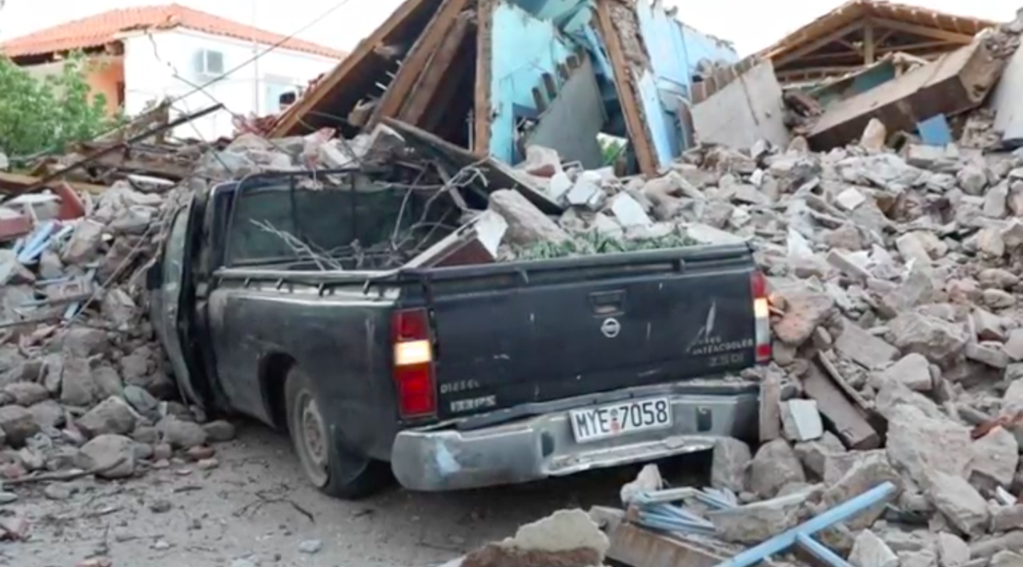 Collapsed buildings were surrounded by piles of rubble and debris-covered cars blocked the narrow streets of Vrissa, a community of around 600 people to the south of the island.