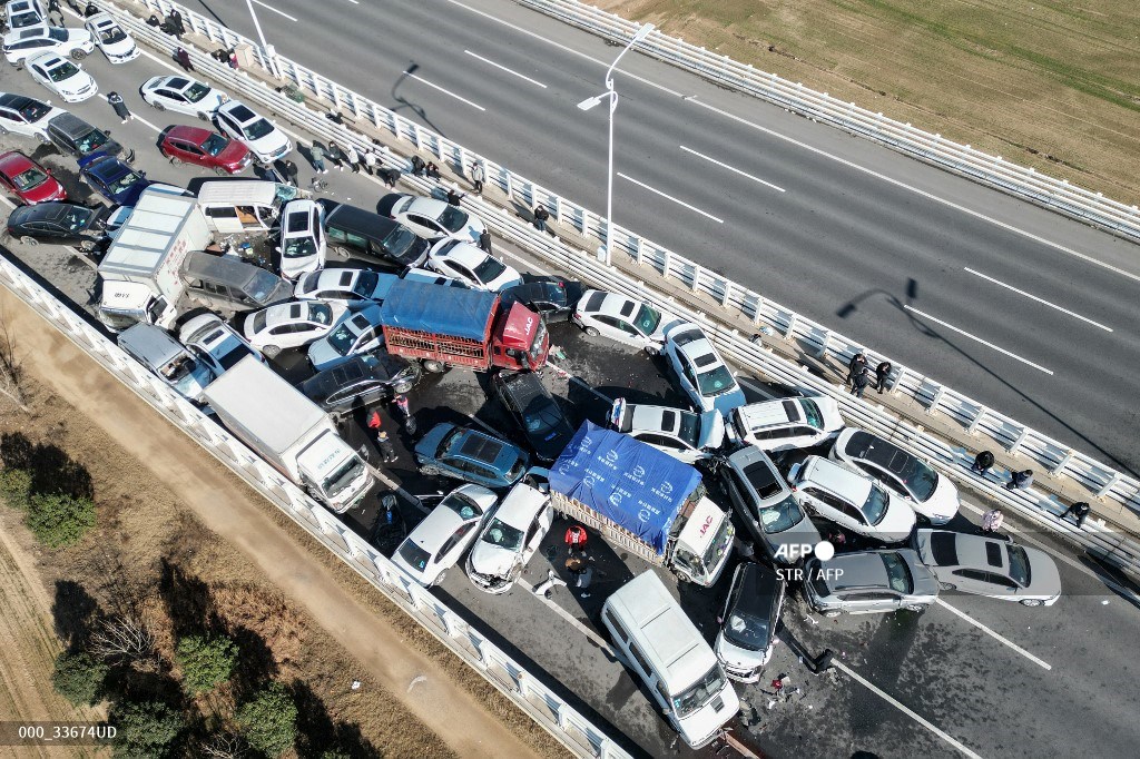 Aerial pictures showed hundreds of passenger cars, vans and lorries — many of which had smashed into one another — piled up on one section of the highway in dense fog.