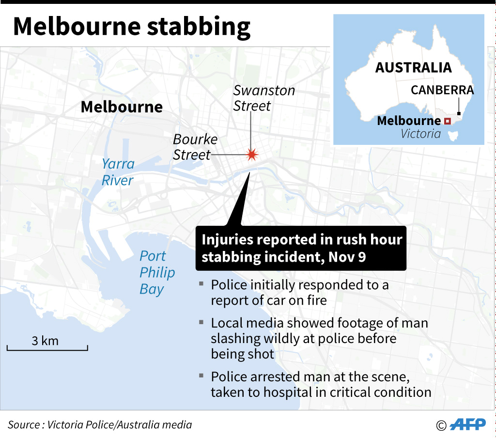 MELBOURNE, Australia (AFP) — One person was killed and two others were injured in a rush hour stabbing rampage in downtown Melbourne Friday, that saw police shoot a knife-wielding suspect near a burning vehicle.