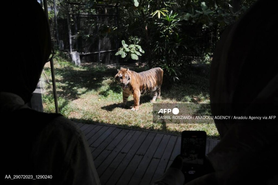 YOGYAKARTA, INDONESIA – Visitors look closely to the 19-year-old Sumatran tiger (Panthera tigris sumatrae) named Lili at the Gembira Loka Zoo in Yogyakarta, Indonesia (Photo by Dasril Roszandi / ANADOLU AGENCY / Anadolu Agency via AFP)