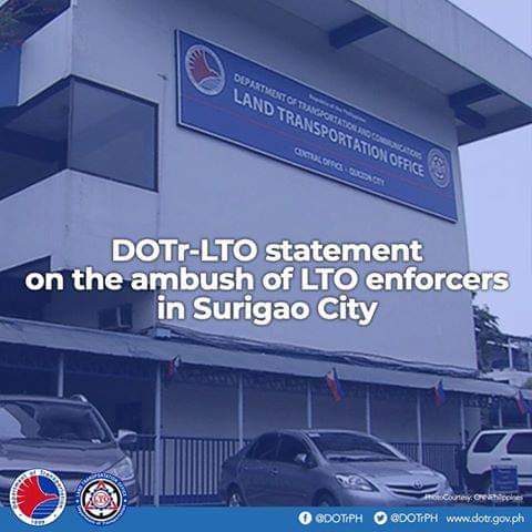 (Eagle News)–The Land Transportation Office on Wednesday, July 17, condemned the ambush on an LTO enforcement team in Surigao City that led to the death of the team leader and caused injuries to two others.