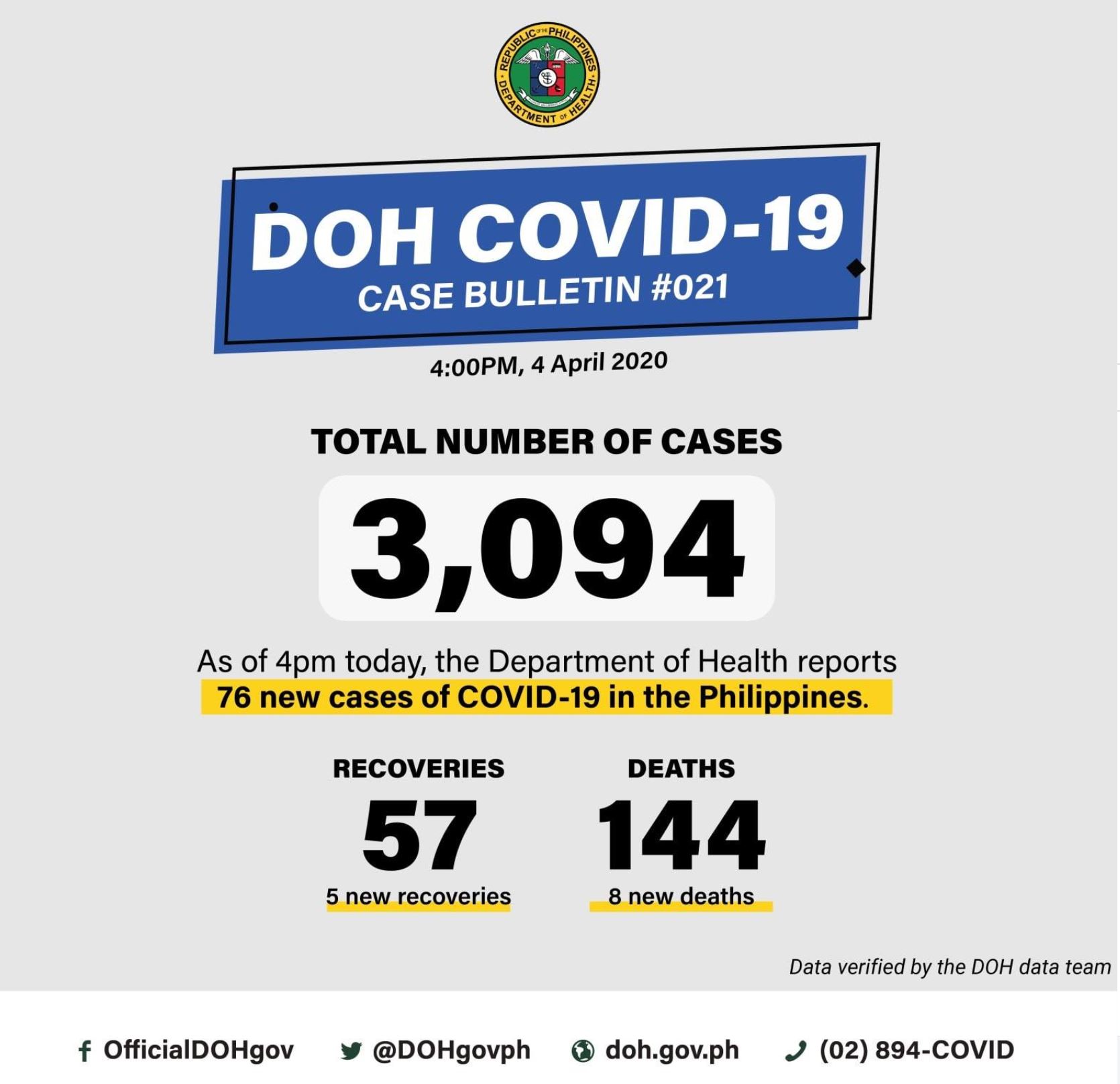 (Eagle News) – Only 76 new COVID-19 cases were reported in the past day bringing the total cases in the country so far to 3,094, with five additional recoveries as of Saturday, April 4, according to the Department of Health.